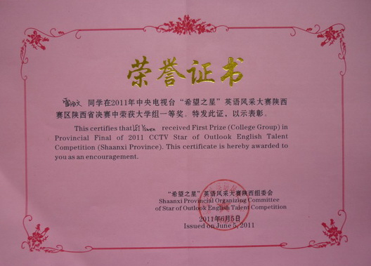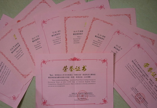 我院2011年“立业杯”英语演讲竞赛选拔出的10名英语专业学生参加了本次大赛。经过激烈的角逐,4名学生进入陕西赛区决赛。其中,雷怡文同学获得陕西赛区大学组一等奖;史洋洋、赵轩、白飞飞等3名同学获得陕西赛区大学组二等奖;强红叶等6名同学获得陕西赛区大学组三等奖。