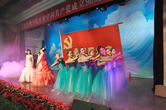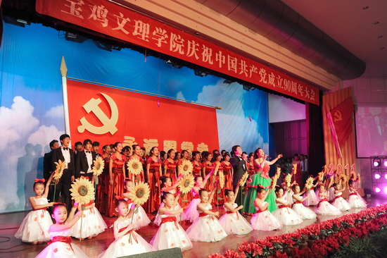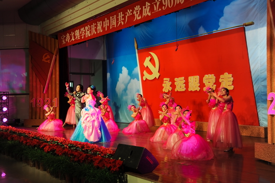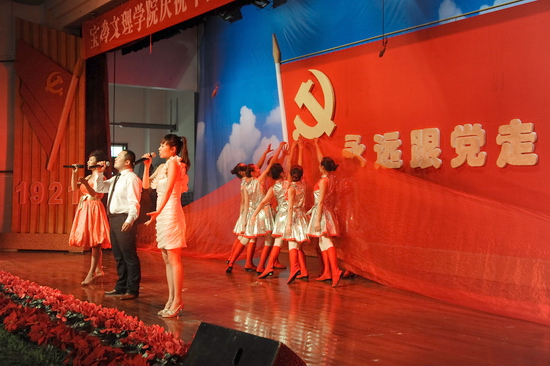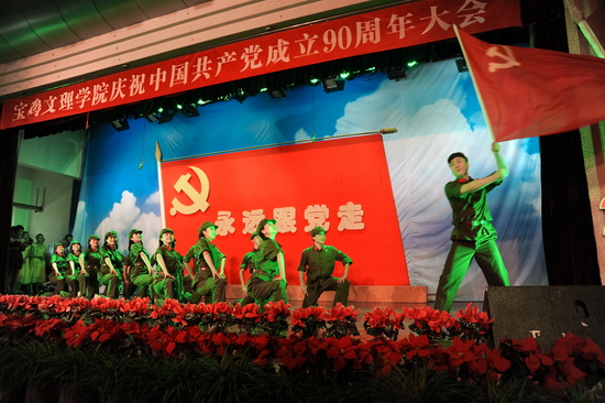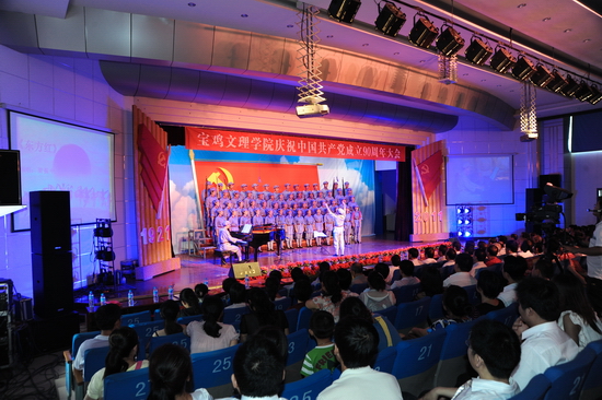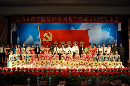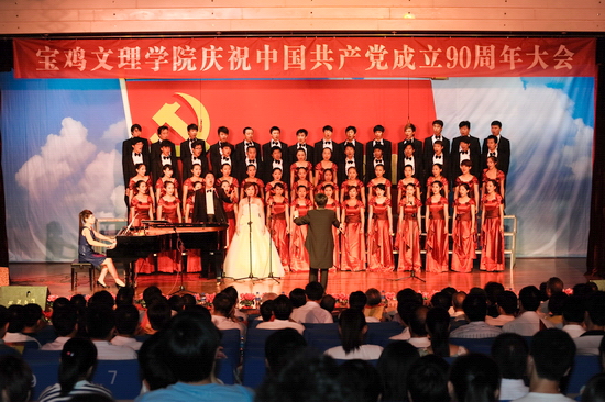 随后,学院举行了庆祝建党90周年“红色经典合唱音乐会”。音乐会上,一首首红歌结合现代化的声光电技术,将观众的心带进了党90年的历史与辉煌。混声四部合唱《东方红》、《没有共产党就没有新中国》、《十送红军》、《五彩云霞》、《四渡赤水出奇兵》、《山丹丹开花红艳艳》、《松花江上》、《游击队歌》、《绣红旗》、《解放区的天》、《祖国颂》等歌曲深情回顾了党从建立到带领人民实现民族独立的征程。混声四部合唱《宝鸡文理学院校歌》以其欢快的节奏展示了我院在大学文化建设方面的成就和师生员工的精神风貌。配乐诗朗诵《颂歌献给党》诵出了文理人50余年办学历史及各项事业取得的成果。《健身排舞》融合体操等动作表达了文理人对党的敬仰与热爱之情。女声二重唱《党啊,亲爱的妈妈》深情歌颂了党的丰功伟业。女声独唱《在希望的田野上》、男女声二重唱《走进新时代》、男女声三重唱《红旗飘飘》、男女声二重唱《阳光路上》、合唱《走向复兴》等唱出了党改革开放以来领导全国人民逐步实现民族复兴的伟大征程。整个音乐会气势磅礴、高潮迭起。音乐会在全体演职人员与现场观众共同高唱《歌唱祖国》声中落下了帷幕,在优美旋律中,院领导走上舞台,与全体演职人员合影留念。