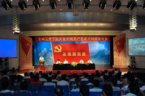 6月28日下午,“宝鸡文理学院庆祝中国共产党成立90周年大会”在新校区音乐厅隆重举行。院党委书记、院长王志刚,院党委副书记、纪委书记米晓东、院党委副书记、工会主席李全武,副院长傅志军、王普藩出席大会。王志刚作了重要讲话,米晓东主持大会。