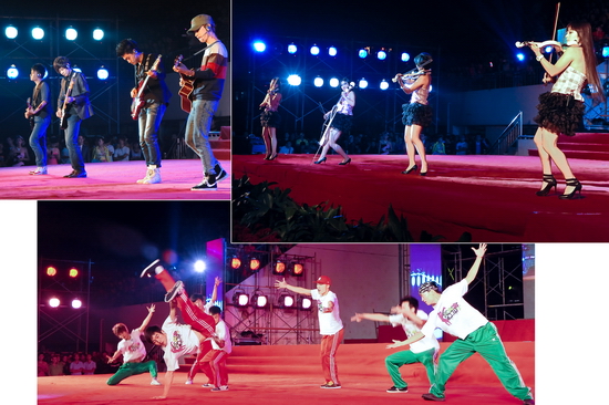 晚会在大型歌舞《年轻的朋友来相会》中拉开了帷幕,充满青春活力的歌声与舞蹈点燃了现场观众的热情。独唱《儿行千里》、歌伴舞《长大后我就成了你》等歌舞旋律优美,真挚感人,唱出了新生对父母及老师的感恩与祝福;动感提琴《花海》、歌舞串烧《炫时代》、舞蹈《青春步伐》、诗朗诵《以青春的名义宣誓》彰显了新时期大学生的青春风采和对未来生活的向往;2011级新生表演的激昂奋进的校歌,唱出了新生对母校的热爱和对未来的渴望;96401部队军训教官演唱的《漂亮女兵》和硬气功表演更将现代军人的素质和才艺展示无余;歌伴舞《兵哥哥》表达了人们对军人的由衷赞美;歌伴舞《中国大舞台》、男女二重唱《祖国正是花季》、歌伴舞《红旗飘飘》表达了文理人对祖国母亲的深情祝福和对美好生活的赞美与憧憬,更是将整台晚会推向了高潮。最后,在歌舞《相亲相爱》的优美旋律中,院领导走上舞台,与全体演职人员合影留念。