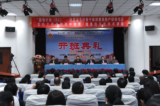 10月19日下午,学院在老校区综合楼一楼报告厅隆重举行“国培计划”——陕西省农村青年教师能力提升置换脱产研修项目宝鸡文理学院初中信息技术、初中地理学科培训班开班典礼。院党委副书记李全武,“国培计划”陕西省项目执行办公室副主任、陕西教育学院师资培训学院院长王奂新,“国培计划”陕西省项目执行办公室项目主任苏理,学院地理科学与环境工程系主任韩景卫,学院“国培计划”初中信息技术学科首席专家、教育科学与技术系主任王富平以及来自全省各地市农村基层一线的90多名初中信息技术、地理学科参训教师参加了开班典礼。我院继续教育学院院长李宏涛主持开班典礼。
