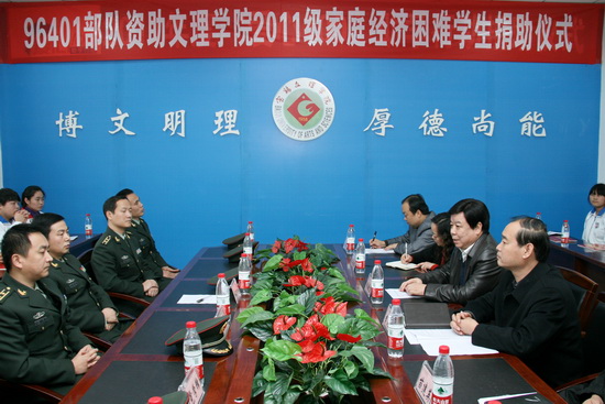 11月29日下午,96401部队首长一行6人来我院捐助家庭经济困难学生,捐助仪式在我院新校区第一会议室举行。96401部队政治部副主任甘业元等部队首长和我院党委副书记米晓东、学工部部长李周让、化学系党总支书记苗建英、党委办公室副主任、院长办公室副主任王永君、大学生资助管理中心主任刘景世及受资助学生参加了捐助仪式,仪式由李周让主持。