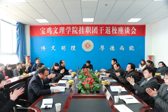 2月17日下午,学院在新校区第一会议室召开我院派往眉县、佛坪县团委开展为期一年的挂职团干返校座谈会。院党委副书记米晓东,组织部部长郑存库,学工部(处)长李周让,宣传部副部长孙宏健,学工部副部长刘景世,学工部副部长、团委书记黄玮,学生处副处长郝晓炜,团委副书记党建波及全院各系团总支书记参加了座谈会。座谈会由郑存库主持。