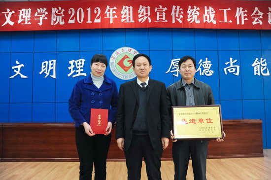 会上,王志刚为获得“陕西省教育系统2011年度精神文明建设和宣传思想工作高校系、处级单位先进集体”的外语系,获得“陕西省教育系统2011年度精神文明建设先进个人”的美术系党总支书记唐晓育颁发了奖牌和证书。党委组织部部长郑存库,党委宣传部、统战部部长彭志启分别就我院2012年的组织、宣传和统战工作作了详细的安排部署。与会同志集体学习了《陕西省贯彻落实〈中国共产党普通高等学校基层组织工作条例〉实施办法》,外语系、化学化工系、计算机科学系和美术系四个党总支先后作了大会交流发言。