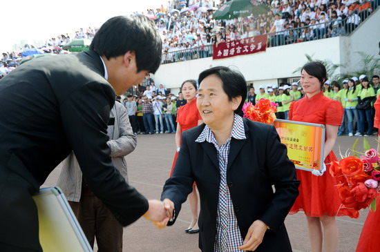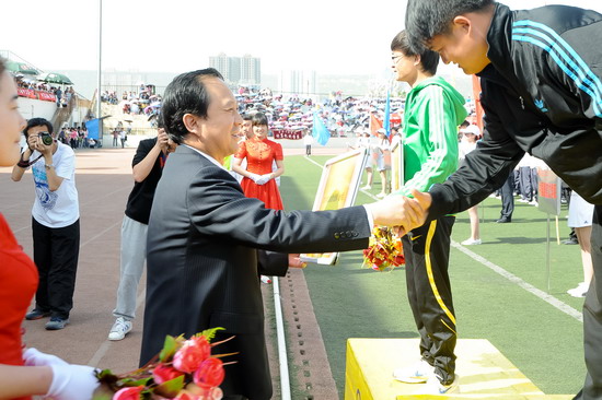 傅志军代表学校党委和行政向取得优秀成绩的代表队和运动员表示热烈的祝贺,向为运动会成功举办付出辛勤劳动的组委会全体成员、全体运动员、教练员、裁判员以及工作人员和全院所有老师、同学们表示衷心的感谢!他说,本届运动会是一次“文明、热烈、高效、和谐”的体育盛会,在“更快、更高、更强”的奥林匹克精神激励下,师生同场竞技,展现了文理人的风采,取得了体育竞赛和精神文明的双丰收。他要求广大师生以本次运动会为契机,再接再厉,积极响应教育部、国家体育总局、共青团中央联合下发的阳光体育运动号召,弘扬快乐体育、健康体育的理念,牢固树立终身体育的思想,积极进行体育锻炼,开创我校体育工作的新局面。