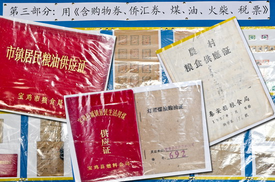 本次票证展由数学系党总支主办,展出的1800多枚票、35种证均由数学系党总支副书记、宝鸡市收藏家协会会员王拴堂提供。本次展出分三部分,第一部分:吃——含粮、油、肉、副食品票。主要有全国通用、军用、四个直辖市、五个自治区以及部分省、地市粮、油、料票,工种票,副食品票,餐票。第二部分:穿——含布、线、棉、鞋票。第三部分:用——含购物券、侨汇券、煤、油、火柴、税票,购物证、粮油证、派购证、农业税证、工分本等。票证是在新中国成立后,在各种商品极度匮乏的情况下应运而生的,为了做好人们生活必需品的合理配置,从1953年开始,我国实行商品凭票(券)、凭证(卡)供应,其商品供应的品种以及定量和实施办法,随着每个时期的具体情况而变化。