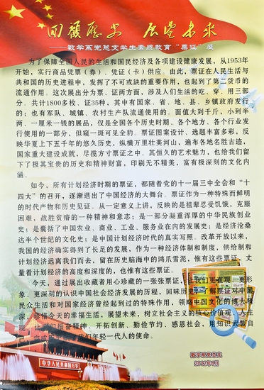 数学系从4月25日起在思贤楼419展室向全校师生展出一个月时间。布展以来,前来参展的师生骆绎不绝,都对展出的票证产生了很大的兴趣。许多参展后的同学说:“看着这些票证,想到物资匮乏的那个年代,我们会更加努力学习,将来把祖国建设的更加美好”。