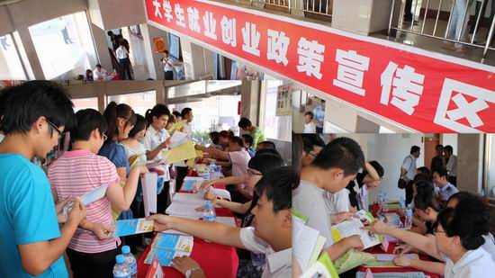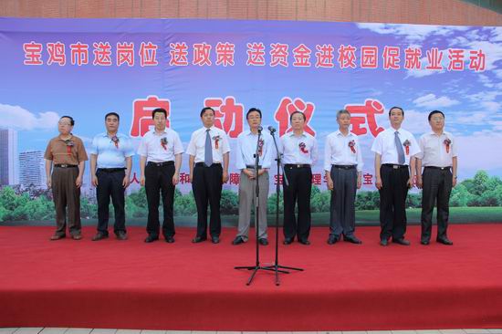 为了进一步推动大学生就业创业工作,6月9日,我校与宝鸡市人社局在新校区思贤楼联合举办“送岗位送政策送资金进校园促就业”活动,整个活动分为启动仪式、就业洽谈、就业创业政策咨询等三项内容。宝鸡市政府副秘书长王宝强、市人社局局长陈留根、宝鸡职业技术学院副院长刘公信以及我院副院长杨子元等领导出席会议,用人单位代表、我校和宝鸡职业技术学院4000多名学生参加了活动。