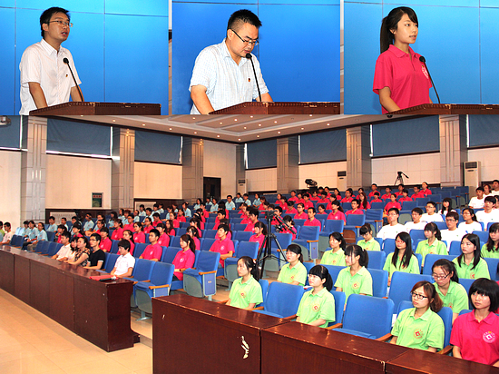 仪式上,米晓东、李周让向校级实践小分队授旗,校团委副书记党建波宣读了社会实践小分队带队教师及队员名单。带队教师张磊带领全体队员作了承诺宣誓。化学化工系团总支书记张波、“青马工程”第五期培训班学员、经济管理系王思思分别代表带队教师和实践队员发言。