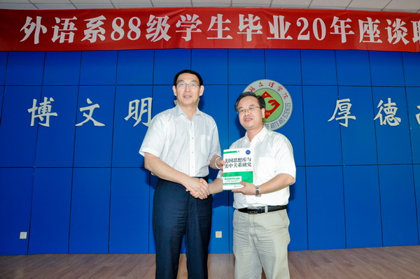 最后,外语系88级校友、环球智库研究院副院长、中共中央党校国际战略研究所穆占劳教授代表全体校友向学校赠送书籍,全体校友感谢母校和恩师,向老师赠送了纪念品,并与辛勤培育自己的各位恩师和学校领导合影留念。