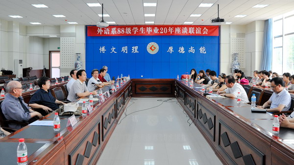 7月31日上午,我校外语系88级校友师生座谈联谊会在新校区甘棠厅举行。党委书记、院长王志刚出席座谈会并作重要讲话。党委副书记李全武、党委办公室主任王永君、外语系副主任王卫强以及外语系部分退休老教授、在岗教师和来自全国各地的30多名外语系88级校友参加了座谈会。