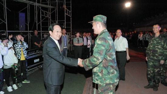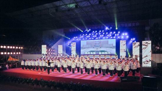 金秋送爽,师生相聚激情鼎沸;声震八方,军民联欢其乐融融。9月19日晚,学校新校区体育场内流光溢彩,歌声如潮,宝鸡文理学院2012年“庆国庆、迎新生”军民联欢晚会在这里隆重举行。校党委书记、校长王志刚,党委副书记米晓东、李全武,副校长傅志军、赵荣侠、杨子元,军训团团长、96401部队张智华,学校各职能部门、各院系(部)负责人,军训团全体教官出席晚会,与2012级全体新生及师生代表8000余人共同度过了一个美好而难忘的夜晚。