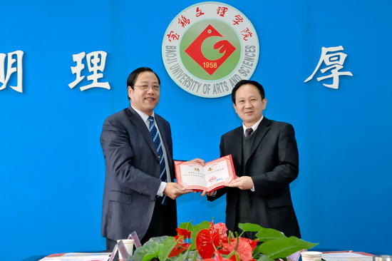 聘任仪式上,王志刚代表学校对赵宗福教授受聘为我校特聘教授表示热烈欢迎和衷心感谢!他从办学历史与传统、师资队伍、学科建设与科研、区位优势、本科教学工作水平评估获优、发展中的大学等六个方面简要介绍了学校的基本情况。他说,中国语言文学学科是我校的品牌学科,省级高校哲学社会科学重点研究基地——关陇方言与民俗研究中心立项建设以来得到省教育厅的大力支持与高度评价,我校非常重视邀请在民俗文化研究、文学史研究、方言研究等领域的国内外著名专家学者来指导学科建设与科研工作,相信有赵院长的鼎力指导,文学与新闻传播学院的学科建设与发展特别是我校省级高校哲学社会科学重点研究基地建设与发展,一定会迈上新的台阶。赵宗福教授表示受到学校聘请十分荣幸,并对学科建设、科研项目管理、研究生培养工作提出了宝贵意见。最后,王志刚向赵宗福颁发了聘书。