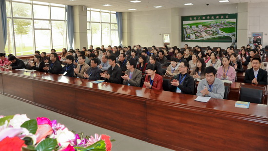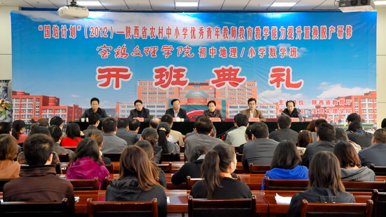 10月30日下午,我校在新校区甘棠厅举行“国培计划”(2012)——陕西省农村优秀青年教师教育教学能力提升置换脱产研修项目宝鸡文理学院初中地理、小学数学班开班典礼。我校副校长赵荣侠,陕西省国培计划项目执行办公室主任、陕西师范大学教师干部教育学院院长袁奋光,陕西省国培计划项目执行办公室项目部主任苏理,我校数学系主任、国培计划小学数学班首席专家赵天绪,国培计划初中地理班首席专家郭俊理以及来自全省各地农村中小学基层一线的70名初中地理、小学数学学科参训教师参加了开班典礼。我校继续教育学院院长王陆军主持开班典礼。
