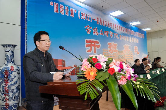 袁奋光受教育厅张厅长和罗处长的委托,代表省教育厅和师资师范处、国培计划陕西省项目执行办公室向本次培训班的顺利开班表示热烈祝贺,向承办本次培训的我校领导和老师表示谢意,并向来自陕西省基础教育第一线的各位参训教师表示欢迎!袁奋光通报了陕西省中小学教师队伍建设的形势和师资培训工作的基本情况,对本次培训班工作提出了希望和三点建议:一是希望宝鸡文理学院不辜负省教育厅的重托,高度重视,全力以赴,切实加强项目管理,高质量地做好培训工作,并尽可能给参训学员在学习生活各方面提供便利条件,确保培训质量和效果,同时努力创新,形成培训特色,为全省教师培训提供好的经验与做法。二是希望各位参训教师牢记使命,潜心研修,努力成为本地的种子教师和育人榜样;建议各位参训教师第一要修德正身,胸怀高远之志。第二要精修业务,力行育人之责。第三要珍惜机会,永存进取之心,以一个普通学员的身份严格要求自己,自学遵守各项纪律,自觉服从学校和班主任的管理,排除干扰、静下心来参加学习,展现出新时期人民教师的风采和魅力。
