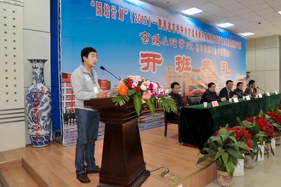 最后,初中地理班学员、来自汉中西乡的教师方亿宁代表参训学员作了发言,他代表全体学员向为参训学员搭建学习平台、营造良好生活环境的省教育厅、国培项目执行办公室、各级教育部门以及宝鸡文理学院的领导、老师表示崇高的敬意和由衷的感谢。表示一定会满怀激情地面对这次培训,严格遵守培训纪律,认真学习,积极思考、主动交流、深入钻研,提高自身专业素养与业务能力;珍惜培训机会,把此次培训看成是职业生涯的一次历练,虚心接受导师的帮助和辅导,通过培训进一步完善自我,超越自我,为今后的教学工作打下坚实的基础,发挥好引领、辐射、示范作用。