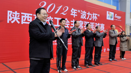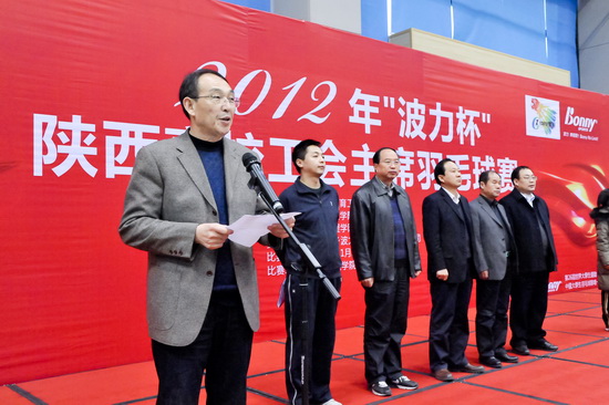 李岳文代表陕西省总工会对“陕西高校工会主席2012年“波力杯”羽毛球赛”的举行表示热烈祝贺!向为本次活动精心策划、积极准备做出贡献的省教育工会、宝鸡文理学院工会及参赛运动员表示衷心的感谢!向为本次赛事工作的裁判员及工作人员表示崇高的敬意!向为本次活动冠名赞助的桐乡波力科技有限公司表示衷心的感谢!他希望参赛运动员重在参与、重在学习、重在提高、重在娱乐,赛出水平,赛出风格,赛出友谊,赛出风尚。