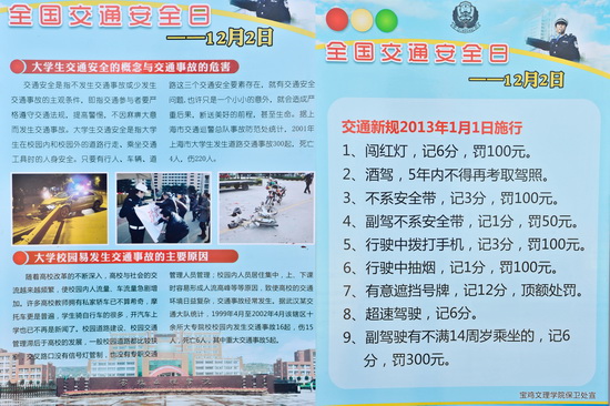 今年是第1个“全国交通安全日”,我校于12月2日举办了交通安全法规专题宣传展,校党委副书记米晓东检查我校交通法规宣传工作并到现场参观了本次宣传展。