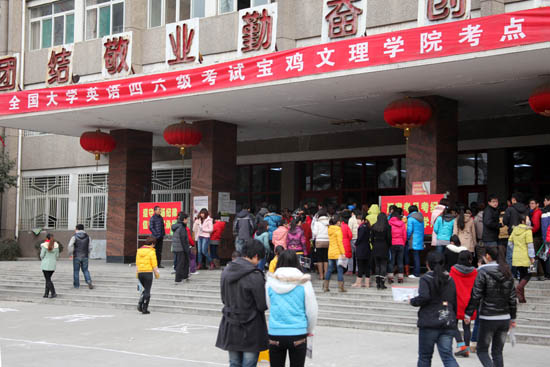 宝鸡文理学院考点共有10521名考生参加了考试,其中四级报考7701人,六级报考2337人,A级报考483人。四级考试设六个考区,考场共259个,六级考试设三个考区,考场共79个,A级设一个考区,考场共17个,涉及监考、考务人员783人次。按照陕西省考试管理中心要求,为了充分做好本次考试的各项工作,教务处按照学校要求,对监考教师进行了遴选,确保监考过程规范和监考质量,并分别组织召开了大学英语四六级和高等学校英语应用能力考试监考教师培训会、考务工作人员培训会,对监考和考务工作操作规程进行了认真细致地学习和宣传,各院系在考前对考生进行了严肃考风考纪等方面内容的宣传教育。