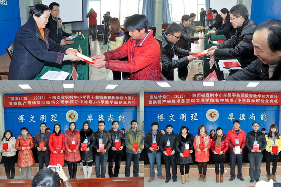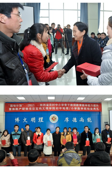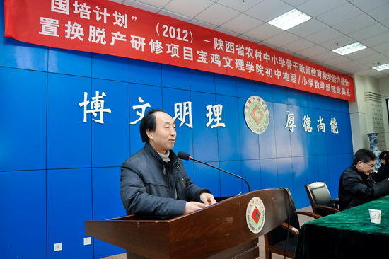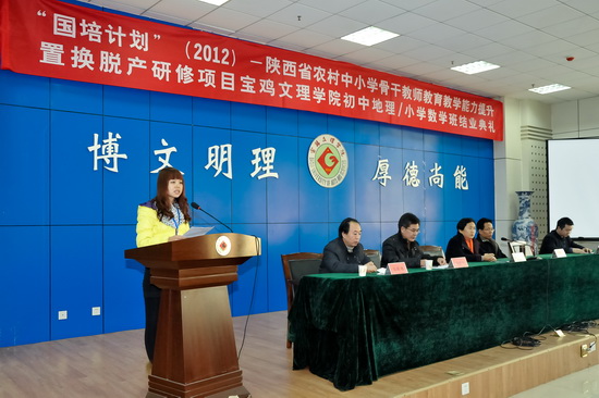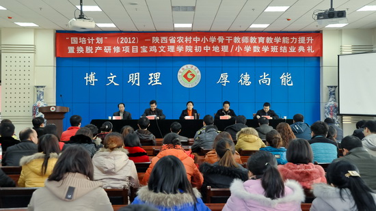 1月11日下午,我校在新校区甘棠厅隆重举行了“国培计划”(2012)陕西省农村中小学优秀青年教师教育教学能力提升置换脱产研修项目宝鸡文理学院初中地理、小学数学培训班结业典礼。我校副校长赵荣侠教授、继续教育学院院长王陆军教授,“国培计划”小学数学学科首席专家、数学系主任赵天绪教授和地理与环境工程学院郭俊理教授以及来自全省各地市农村基层一线的81名初中地理、小学数学学科参训教师参加了结业典礼。继续教育学院副院长田富平主持结业典礼。