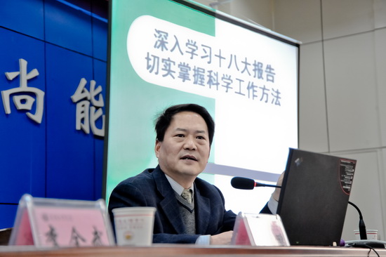 会上,思想政治理论教学科研部主任何振鹏作了题为《深入学习十八大报告,切实掌握科学工作方法》的辅导报告。何振鹏从党的十八大报告的主要内容和基本精神、“中国特色社会主义”中所蕴涵的科学工作方法两个方面就十八大精神向与会人员作了讲解。