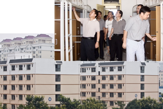 在14、15号学生公寓楼建设工地,王志刚、白黎、杨子元仔细察看了室外水、电、暖管网施工进展情况并进入14号学生公寓实地察看了室内工程建设情况,特别是外籍专家和留学生公寓室内生活设施安装情况和学生公寓架子床、衣柜、书桌等基本设施的安装进展情况,详细询问了建设中的具体细节及相关问题,并提出了一些意见和要求。王志刚要求施工单位要确保工程质量,保证按期交付使用,白黎同时强调要狠抓项目管理,确保工程进度。随后校领导来到老校区幼儿园前园林改造工地、1号教职工单身公寓改造工地和锅炉房锅炉安装等施工现场检查工程建设进展情况。在幼儿园前园林改造工地,王志刚充分肯定了在保护原有树木的基础上,因地制宜地开展园林改造的设计方案和建设效果。白黎要求各有关部门要继续做好园林改造后续工作,按照“四季有绿、三季有花”的思路种植相应的苗木花卉。校领导要求各施工单位和主管部门要在确保工期的基础上严格管理,狠抓质量。在各施工现场,校领导还向冒着酷暑加班加点施工的有关部门管理人员和施工单位表示感谢和慰问。