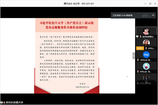 近日,中共中央总书记、国家主席、中央军委主席习近平给复旦大学《共产党宣言》展示馆党员志愿服务队全体队员回信,勉励他们继续讲好关于理想信念的故事,并对全国广大党员特别是青年党员提出殷切期望。7月1日,校团委在线上举办“听党话﹒跟党走﹒做坚定的青年马克思主义者”暨庆祝建党99周年主题团日活动,组织团干部和“青马工程”学员认真学习习近平总书记回信精神,开展交流讨论,分享思考感悟,引起强烈反响。