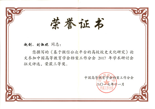 本次会议由中国高等教育学会档案工作分会主办,重庆大学承办,全国高校档案工作者400余人参会。会议主要围绕“推动高校智慧档案馆建设,提升高校档案管理水平”这一主题深入探讨,并公布了中国高等教育学会档案工作分会2017年学术研讨会征文评选结果,赵钊副研究馆员撰写的《基于微信公众平台的高校校史文化研究》荣获三等奖,这是我校在此项评奖中首次获奖。(档案馆 文/赵钊 图/赵钊)