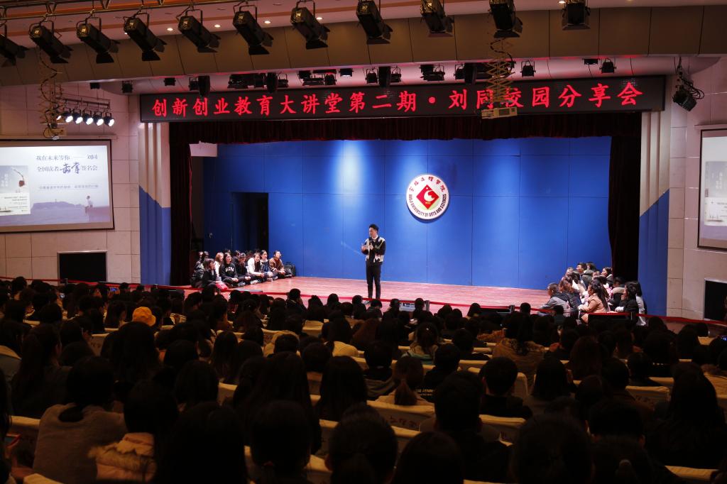 报告会上,刘同向我校大学生分享了自己如何从湖南师范大学中文系的一名学生一步步走到光线传媒影业副总裁的奋斗历程,鼓励大学生要积极规划自己的人生,勇敢地追求理想,珍惜大学时期每一个学习、锻炼的机会,积极参加社会实践,不断丰富自己的社会阅历,努力提升个人综合素质。他积极向上的态度,努力拼搏的斗志,睿智幽默的言语,满满当当的正能量赢得了现场大学生的阵阵掌声。