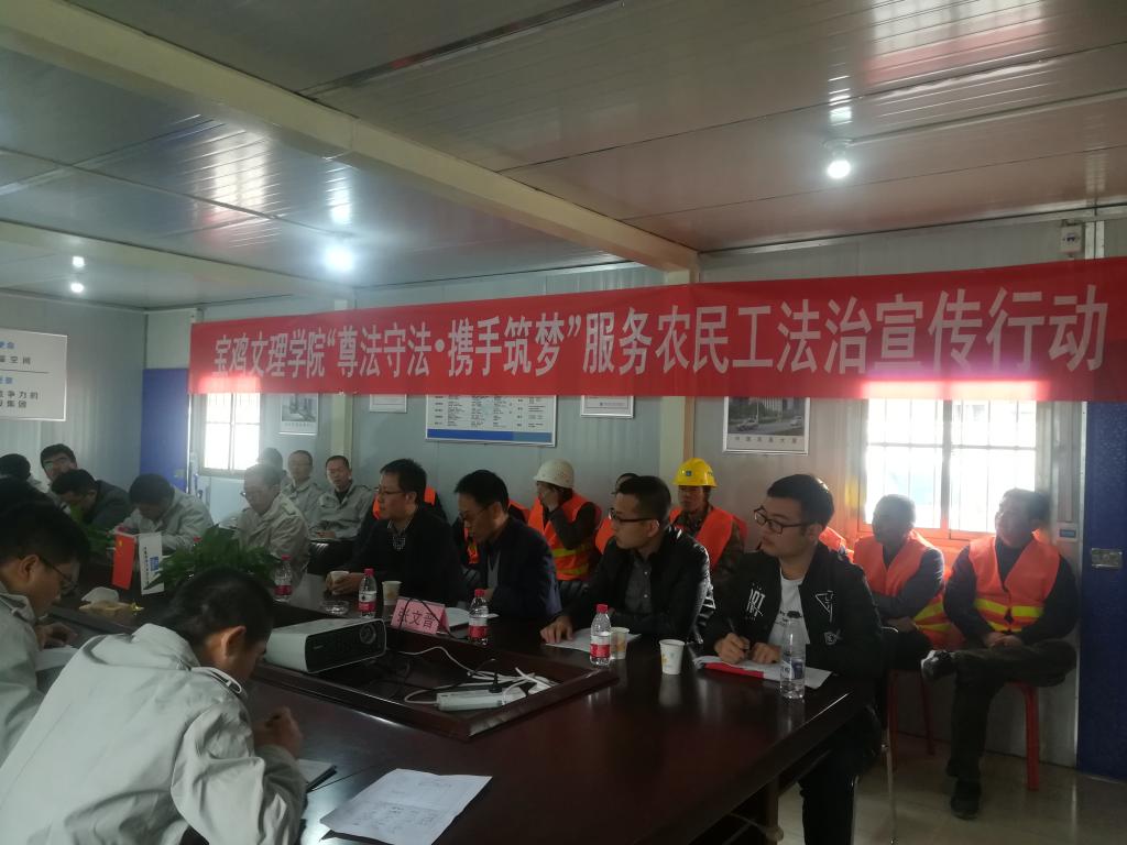 11月10日下午,在校工会的精心组织和宝鸡市建设工程质量安全监督站的大力支持下,我校“尊法守法·携手筑梦”服务农民工法治宣传服务分队前往中建四局三公司朝阳华城项目工地开展法治宣讲活动。