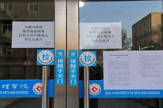 三是学生公寓管理服务中心张贴宣传《宝鸡文理学院预防新型冠状病毒倡议书》,加强门禁管理,不得任何外来人员进入学生公寓。