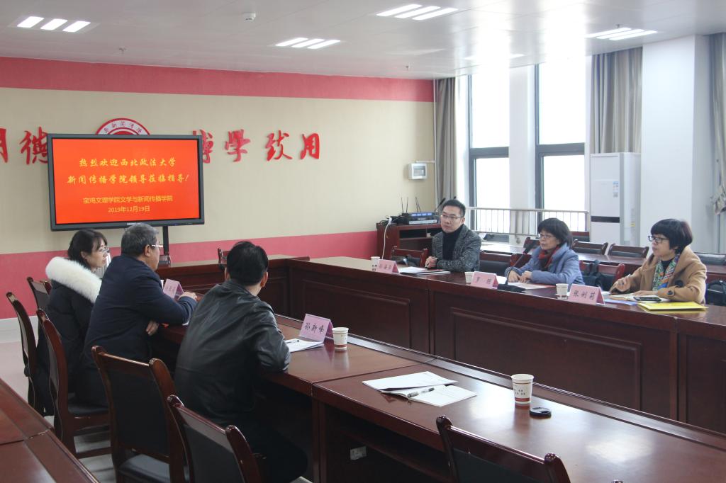 罗朋教授详细介绍了西北政法大学新闻传播学院各专业硕士点(含艺术专业硕士点)招生、培养情况。她指出,宝鸡文理学院作为省内知名高校,有良好的教育教学传统,本科生培养质量较高,同时在研究生教育等方面走在了全省前列。西北政法大学面临申报博士点关键时期,研究生生源质量问题成为发展瓶颈问题。这次来一是参观学习,二是洽谈合作培养新闻传播学研究生事宜。双方与会人员就各自负责、关心的工作进行了对口讨论和交流,在许多方面达成了共识。