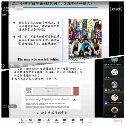3月27日上午,我校在腾讯会议与哔哩哔哩两个平台同步直播举办了“外语学习与学业、职业发展”论坛。论坛邀请了我校地理环境工程学院2017届优秀毕业生、现湖南师范大学教育学在读博士生赵森,物理与光电技术学院2018届优秀毕业生、现广西大学物理与科学工程技术学院在读博士生薛阳,文学与新闻传播学院2006届优秀毕业生、现希腊《中希时报》记者张维女士做了主题发言。三位嘉宾分别从外语学习与大学生活、外语学习与学业规划和学术写作、外语学习与普通女性成长等三个方面进行了交流和分享。