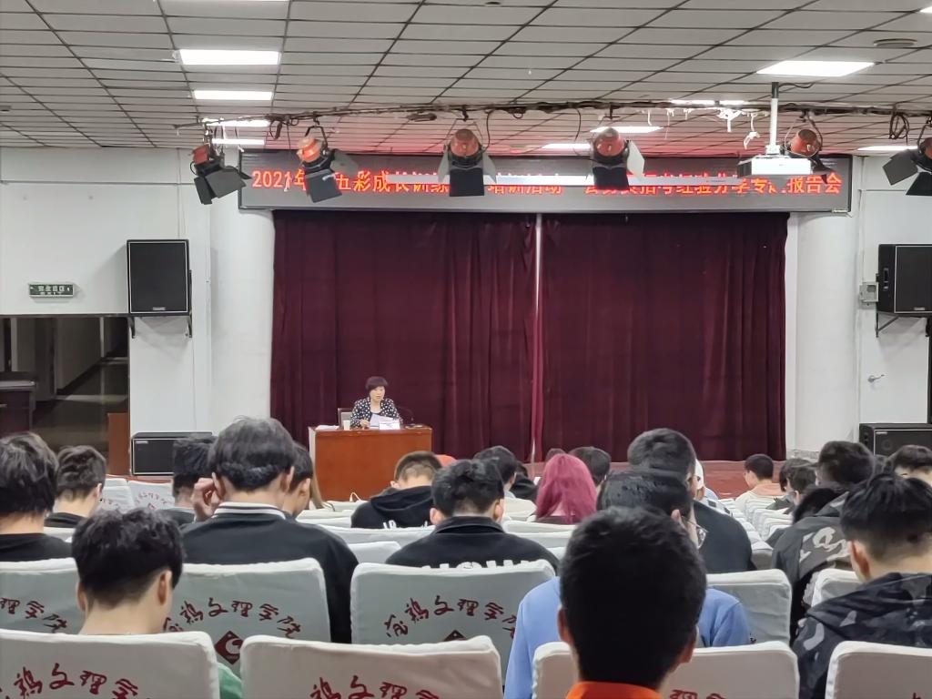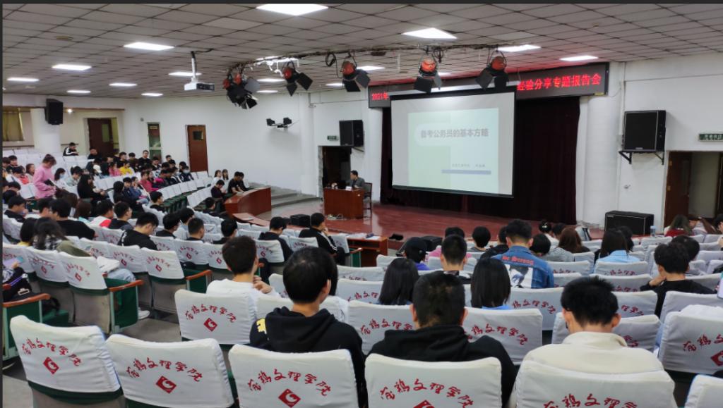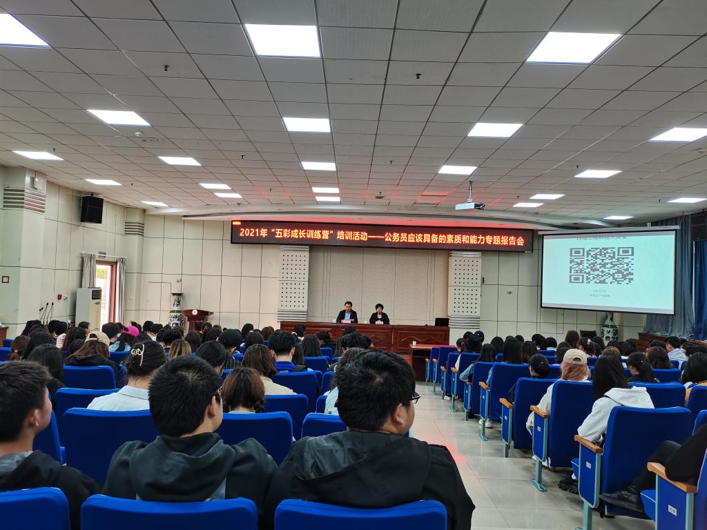 4月28日,学工部(处)分别在高新校区木铎厅、石鼓校区综合楼2号报告厅举办了2021年春季学期“五彩成长训练营”第二期培训活动。宝鸡市委组织部公务员三科科长雷雅萍和我校马克思主义学院教授何振鹏分别作了“公务员应该具备的素质和能力”“备考公务员的基本方略”的主题培训会,共有600多名学生参加了培训。