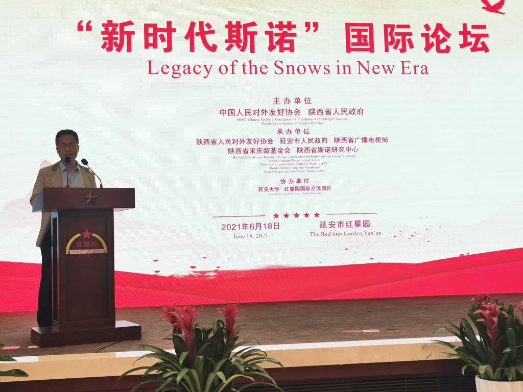 今年是美国记者埃德加·斯诺首次访问陕北85周年,海伦·斯诺首次来华90周年。6月18-19日,由中国人民对外友好协会和陕西省人民政府主办,陕西省人民对外友好协会、延安市政府、陕西省广播电视局、陕西省宋庆龄基金会、陕西省斯诺研究中心承办的“新时代斯诺”国际论坛在延安举行。论坛开幕式由陕西省外事办主任、省对外友好协会常务副会长姚红娟主持,陕西省副省长魏建锋、中国对外好友协会会长林松添致辞。柯马凯(英籍)、埃里克•福斯特(美籍)、安柏然(新西兰籍)等21位国际友人参加论坛。论坛通过线上、线下方式,国际友人代表、政府部门及国内外学者200余人,围绕“国际友人与中国共产党的故事”展开交流。