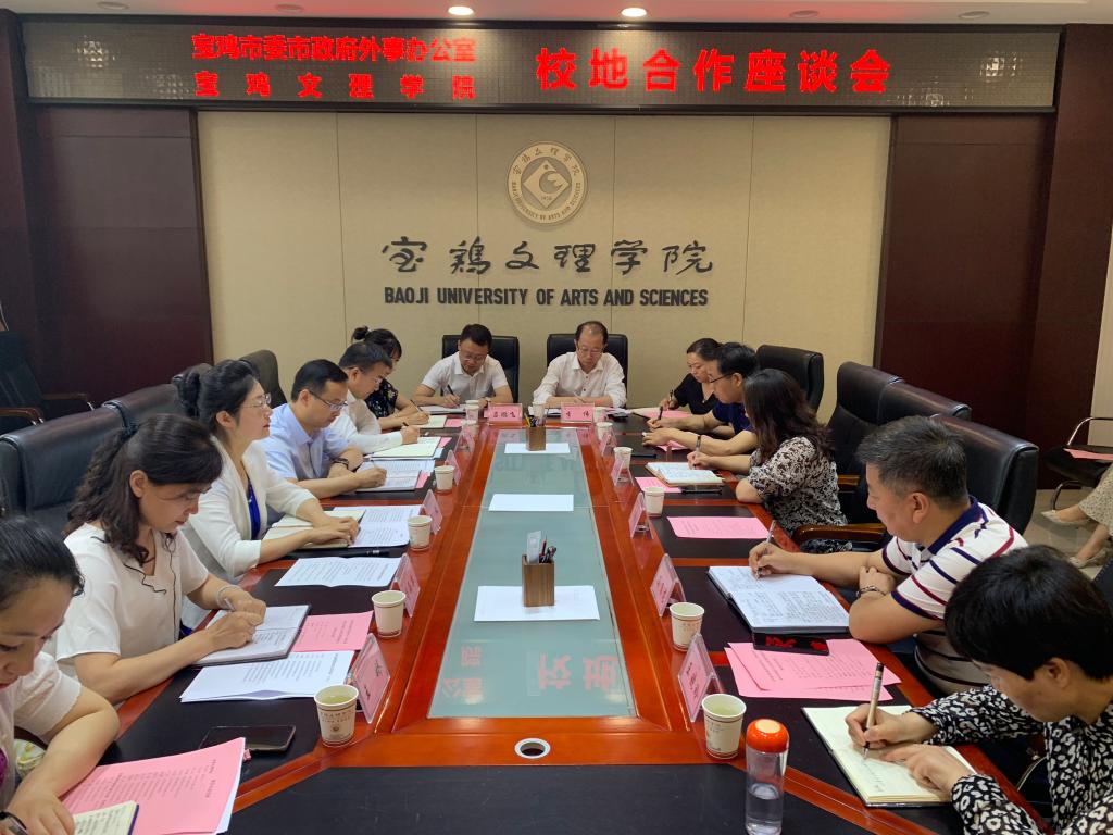 7月2日,我校与宝鸡市委市政府外事办公室、宝鸡市人民对外友好协会校地合作座谈会在高新校区图书馆806会议室举行,外国语学院院长李伟主持座谈会。学校党政办公室主任王永君、党委宣传部长冯飞龙、科研管理处处长王晓玲、国际合作与交流处处长宋崇碧、外国语学院党委书记官莉萍、党委副书记苗亚静、大学外语部主任张雨、翻译服务中心主任苏文军、翻译系主任鱼为全、日语教师闫朝华博士、韩语教师张硕博士,宝鸡市委市政府外事办公室主任、宝鸡市人民对外友好协会常务副会长韩微、市委外办副主任柯昌波、董海琴、市对外友好协会专职副会长卢巍、市委外办综合科科长王娇、市委外办外事科科长张昕、市对外友好协会工作人员吕鹏飞等参加座谈。