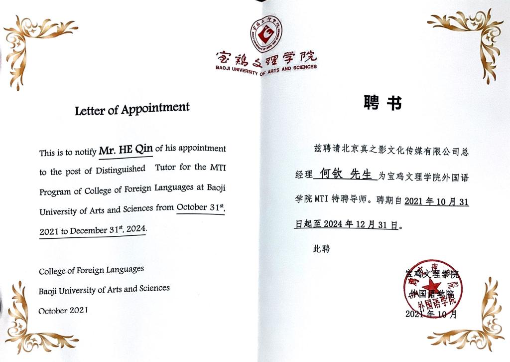 李伟为何钦线上颁发了聘书,聘请何钦为外国语学院翻译硕士(MTI)特聘导师。何钦表示,在母校翻译人才的培养方面,一定会贡献自己的力量,一如既往地带着自己的作品回母校汇报、交流。他希望以后有机会和外国语学院联合培养电影翻译人才,为中国电影走出去、中国文化的国际传播做出贡献。