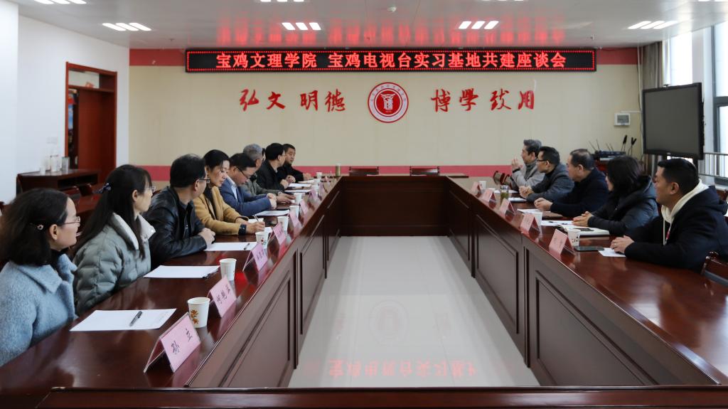 12月2日上午,宝鸡电视台总编辑郭国利、总编办主任张攀、社会新闻部主任王昆、人力资源部主任李静云、传媒营销策划有限公司副总经理刘智等一行五人来我校文学与新闻传播学院调研交流传媒人才培养与合作共建工作,双方在高新校区博文楼1401会议室召开实习基地共建座谈会。会议由文学与新闻传播学院副院长孟改正教授主持。学院班子成员和传媒专业部分教师参加了座谈会。