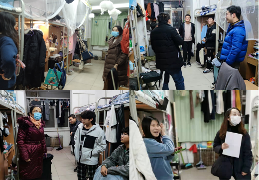 ——加强人文关怀,走访学生宿舍。12月31日晚,由学院副书记牵头,辅导员、班主任深入走访学生宿舍,了解学生近期的学习、生活情况,积极引导学生提高认识和站位,乐观面对疫情,并向他们送上新年的祝福,用真心与爱心陪伴同学们度过这样一个特殊的跨年夜。