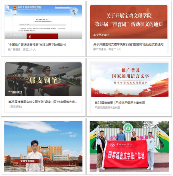 一是向全校发出倡议书,号召全体师生积极参与到国家通用语言文字推广活动中来;二是开展第25届推普周征文,说普通话,写规范字,讲好中国故事;三是举办宝鸡文理学院“诵读中国”经典诵读大赛优秀作品展,赓续红色基因,传播中国价值;四是携手宝鸡铁路小学开展推普活动,用有温度的声音传递伟大的中国梦;五是开展不规范用字案例展,增强语言文字规范意识;六是参与中国教育电视台推普周特别节目节庆日诵读直播,践行语言文化的育人使命。