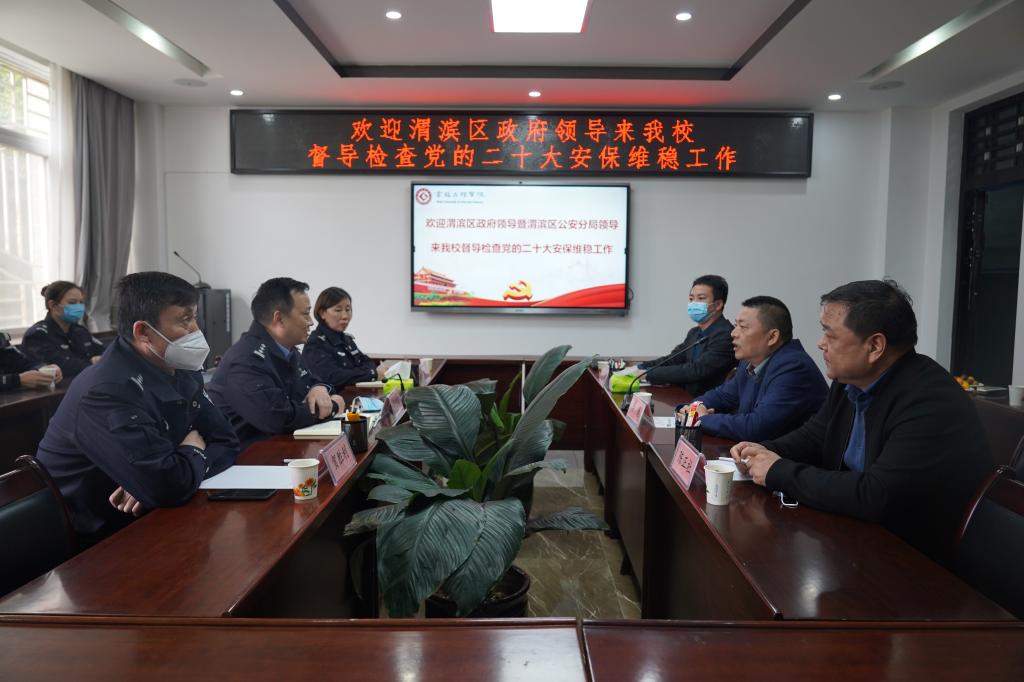 10月14日上午,渭滨区副区长、公安分局党委书记、局长赵英凯,公安分局副局长贺胜利一行来我校调研安全稳定工作。保卫处处长李迪、副处长陈正社,物理与光电技术学院副书记陈冠男参加了调研。