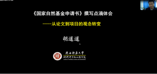 11月30日上午,应我校科研管理处、化学化工学院和陕西省植物化学重点实验室邀请,陕西师范大学博士生导师胡道道教授作了题为《国家自然基金项目申请书撰写体会----从论文到项目的观念转变》的报告。科研管理处处长王晓玲教授,化学化工学院和其他各理工科学院科研人员共120余人以在线会议的方式参加了报告会。报告会由化学化工学院院长胡登卫教授主持。