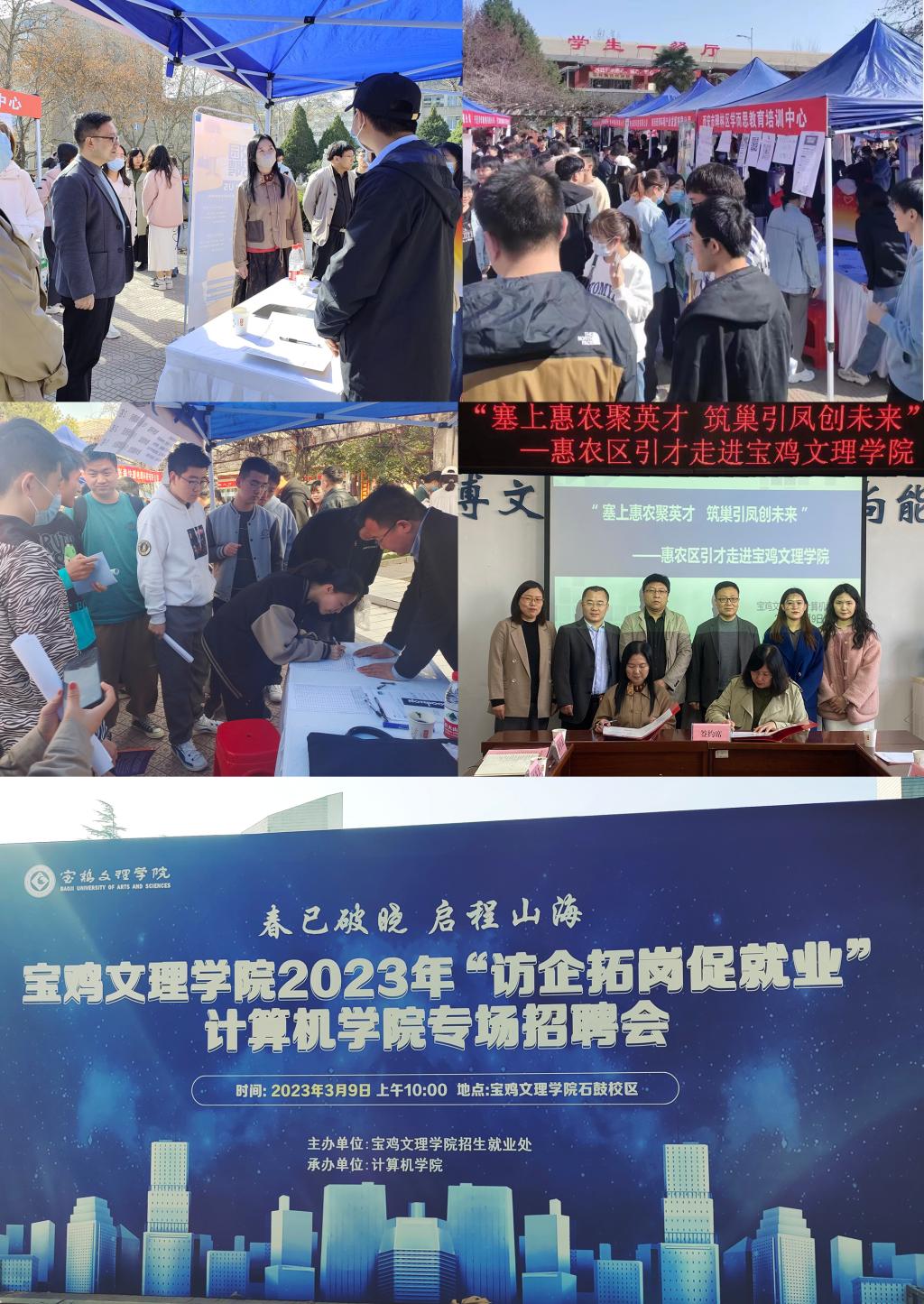 与此同时“塞上惠农聚英才 筑巢引凤创未来——惠农区引才走进宝鸡文理学院”交流座谈会在石鼓校区计算机学院会议室召开。惠农区人力资源和社会保障局局长王霞就惠农区人才招引政策作了说明,她诚挚邀请我校毕业生赴惠就业创业。范英介绍了学校的发展历史、人才培养、更名大学、服务地方等方面情况。她希望校地双方通过践行“请进来、走出去”的理念,在相互赋能、优势互补、合作共赢中,共同打造协同育人的典范,提升学校服务区域经济社会的贡献率。计算机学院院长张光南对学院专业设置、师资队伍和科研实力作了介绍,期待进一步拓宽合作领域,在提升毕业生就业能力和人才培养质量上深度合作、联动提升。双方签署了共建大学生就业基地协议书。