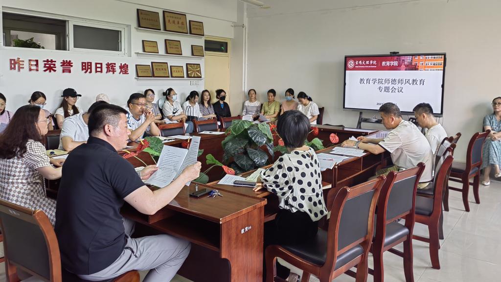 教育学院党委书记白晓旭领学了我校师德师风建设相关文件,并通报了近期教育部、陕西省教育厅公开曝光的违反教师职业行为十项准则典型案例。