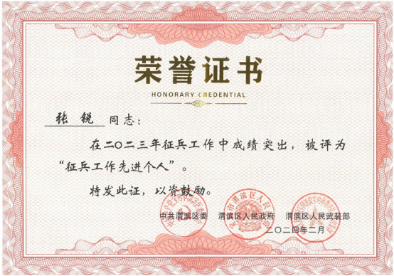 近日,中共宝鸡市渭滨区委、渭滨区人民政府、渭滨区人民武装部发布了《关于表彰2023年度武装工作先进单位和先进个人的决定》(宝渭发[2024]9号)文件,我校电子电气工程学院党委副书记张锐同志荣获征兵工作先进个人荣誉称号。