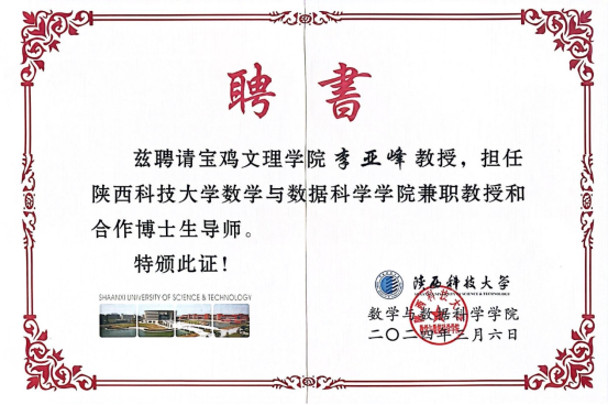 近日,我校计算机学院李亚峰教授受聘为陕西科技大学数学与数据科学学院兼职教授和合作博士生导师,增进了我校与其他高校的学术交流,提升学校的学术影响力。(申请博士学位授权单位工作办公室、计算机学院 文、图/樊攀 审核/孙宏健、张光南)