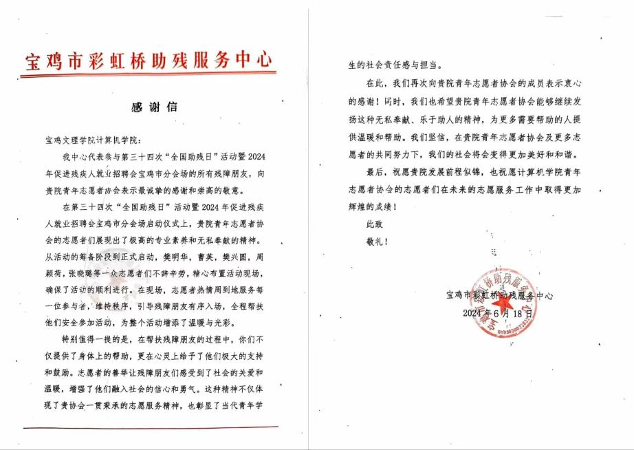 近日,计算机学院收到宝鸡市彩虹桥助残服务中心发来感谢信,信中对学院青年志愿者协会樊明华等17名同学在5月18日第三十四次“全国助残日”活动暨2024年促进残疾人就业招聘会宝鸡市分会场启动仪式上所做的志愿服务表达了感谢。