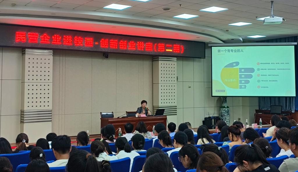 陕西瑞科新材料股份有限公司副总经理谭俊芳做了题为《我们的专业和未来--带着答案去学习》的专题报告,谭俊芳以其丰富的商业经验和独到的市场洞察力,分析了当前人力资源管理新趋势、职业环境、职场需要什么样的人,强调创新思维在企业发展中的核心作用,通过分享她在创业路上的宝贵经验和成功案例,鼓励学生们勇于探索,敢于实践,不断提升自身创新创业能力,为将来职业发展奠定坚实基础。