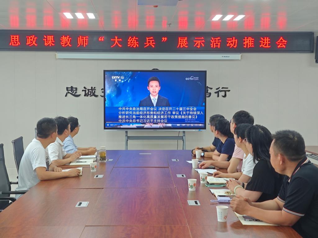 会上,全体参赛教师观看了党的二十届三中全会新闻报道。观看过程中,教师们不仅对会议中提出的重大决策、重要部署以及新思想、新要求有了更加深入的认识和理解,同时也有助于进一步将其融入到教学内容之中。傅文老师结合近几年个人参赛经验,以“对标、迁移、挂靠”三个关键词分享了他在准备思政课教师“大练兵”展示活动中的经验和心得,指出“对标”是要认真分析学情,解决大学生思想上的实际困惑;内容上要深入钻研教材,体现较强的学理性;赛前准备上,要以参加全国性教学比赛的标准来要求自己。“迁移”即把握好每门课程的特性、性质,凝练好教学内容;“挂靠”即虚心请教,学习其他高校其他教师教学比赛经验。傅文老师还特别强调了内在动力对参加教学展示活动的重要性。
