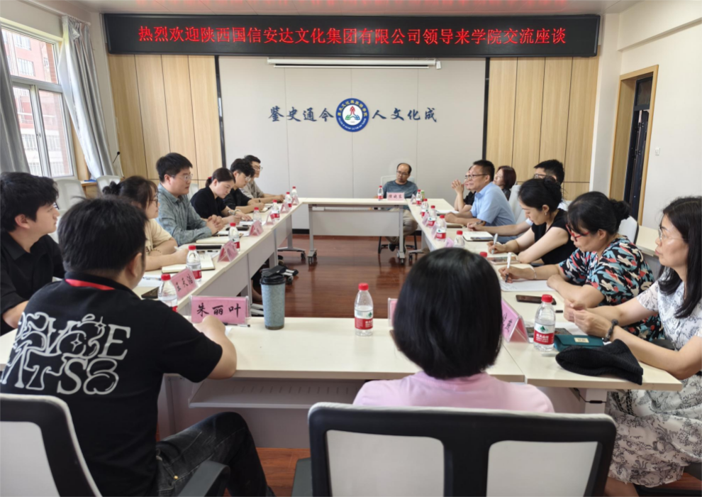 7月31日,陕西国信安达文化集团有限公司董事长张伟一行6人来历史文化与旅游学院交流座谈,双方在高新校区立心楼521会议室召开交流座谈会。历史文化与旅游学院党委书记钱秀峰参加座谈会,院长任晓锋主持会议。